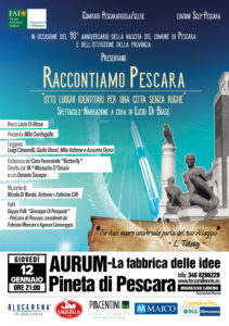 Pescara. In occasione del 90° Anniversario della nascita del comune di Pescara e dell’istituzione della Provincia, il 12 Gennaio all’Aurum si terrà uno spettacolo di narrazione dal titolo: “Raccontiamo Pescara – Otto luoghi identitari per una città senza rughe”. L’evento è presentato dal FAI (Fondo Ambiente Italiano), dal Comitato Pescaratutela/Selfie e da Edizioni Scep-Pescara.