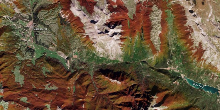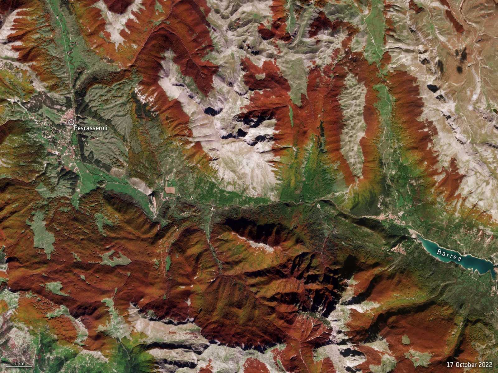 Queste le parole con cui l’Esa descrive il nostro territorio: “Temperature più basse e ore di luce in diminuzione hanno innescato il fogliame autunnale del 2022 nell’Appennino centrale intorno alla valle del Fucino in Abruzzo, in Italia. Le sfumature dell’arancione e del rosso dipendono principalmente dal clima locale, dall’altitudine e dall’orientamento delle piste. Sono visibili il piccolo paese montuoso di Pescasseroli, famosa meta invernale dell’Italia centrale, e il lago di Barrea”.