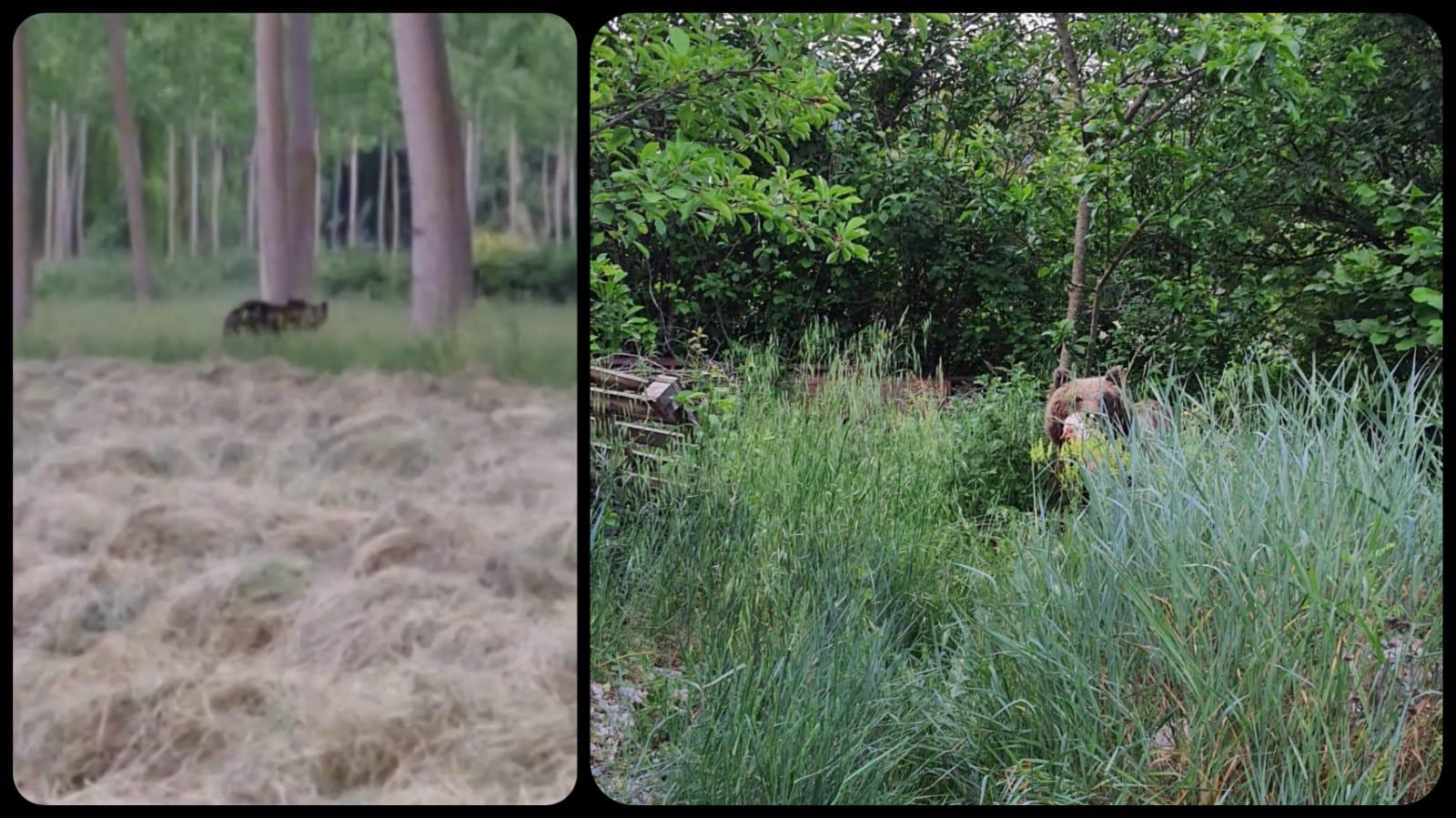 A sinistra l'orso ieri mattina a Pietragrossa, a Paterno, a destra a Casali d'Aschi mentre mangia galline, polli e tacchini...