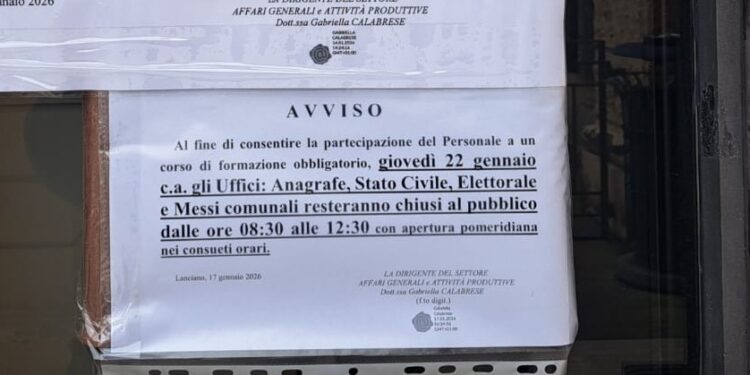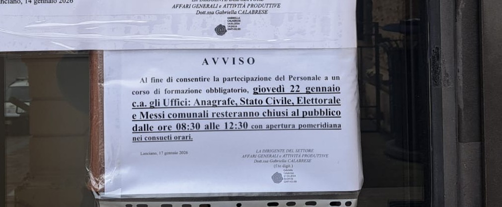 “Si avvisa che, con Avviso della Dirigente del Settore Affari Generali e Attività Produttive, giovedì 22 gennaio gli uffici Anagrafe, Stato Civile, Elettorale, Messi Comunali resteranno chiusi al pubblico nella fascia mattutina, dalle ore 08.30 alle ore 12.30, al fine di consentire la partecipazione del personale a un corso di formazione obbligatorio.