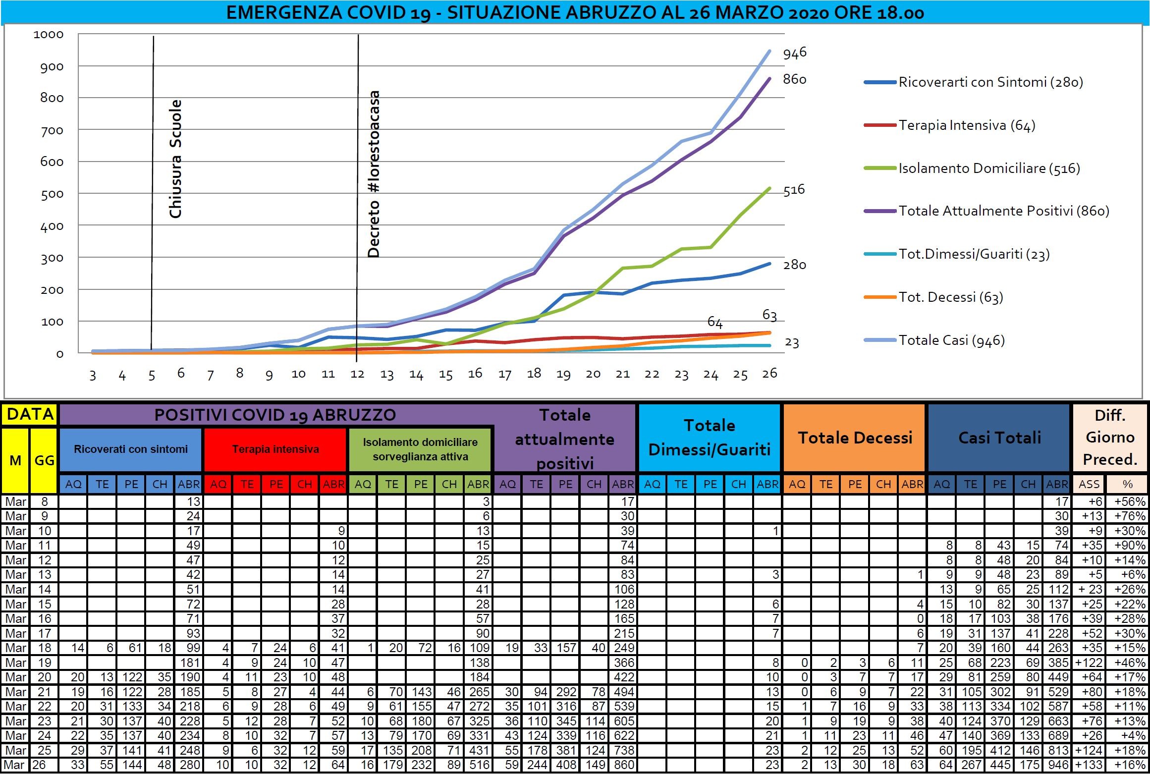 Mortalità. L’Abruzzo è tra le regioni con saldo negativo per differenza tra guariti e deceduti; è fermo ancora a 23 il numero dei primi di cui 16 pazienti clinicamente guariti quelli cioè che da sintomatici con manifestazioni cliniche associate al Covid 19, sono diventati asintomatici e 7 guariti che hanno risolto i sintomi dell’infezione e sono risultati negativi in due test consecutivi. Salgono invece a 63 i decessi, 11 in sole 24 ore che corrispondono al +21.2%.