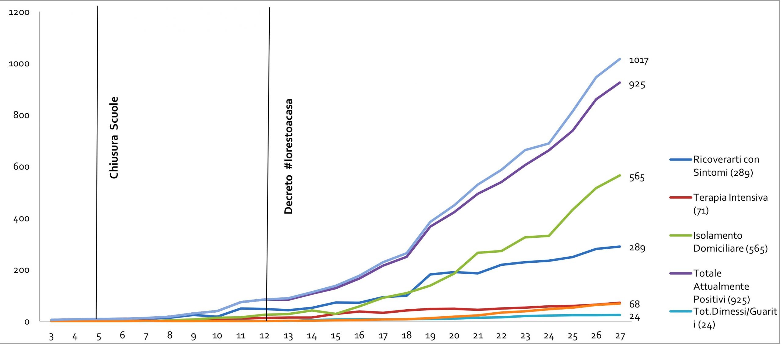 Il bollettino ufficiale. Sono 1017 i casi accertati dall’inizio della emergenza e di questi: 71 (+11%) sono i ricoverati in terapia intensiva e 289 pazienti sono ricoverati in ospedale in terapia non intensiva, per un totale di 360 (4,7%) ospedalizzati e gli altri 565 (+9.5%) sono in isolamento domiciliare con sorveglianza attiva. Ancora in ascesa la curva epidemica dei totali attualmente positivi che con i casi accertati di ieri sale a quota 925 (+7.6%). Nel numero dei casi positivi sono ricompresi i deceduti e chi, fortunatamente, ha superato la malattia. Del totale dei casi positivi, 75 si riferiscono alla Asl Avezzano-Sulmona-L’Aquila, 189 alla Asl Lanciano-Vasto-Chieti, 476 alla Asl di Pescara e 277 alla Asl di Teramo.