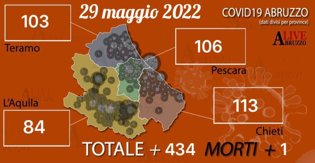L’Aquila. In questa domenica 29 maggio risultano 434 nuovi positivi in Abruzzo, di cui 84 residenti in provincia dell’Aquila , 113 in provincia di Chieti, 106 nell’area di Pescara, 103 nel territorio di Teramo, 10 fuori regione e 18 in fase di accertamento.