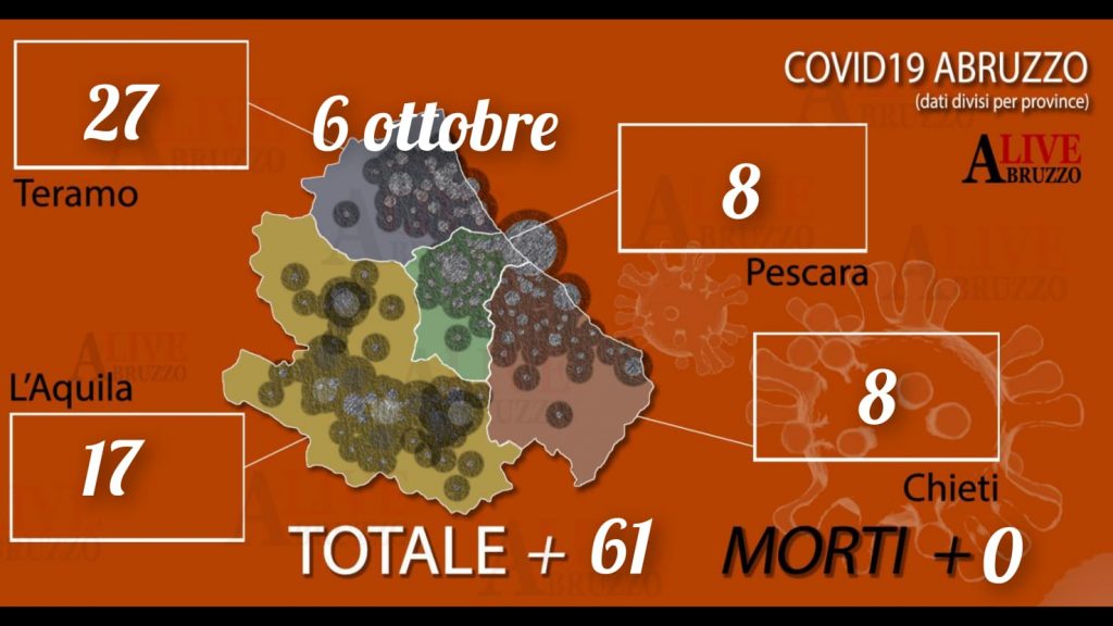 Pescara. Sono 61 (di età compresa tra 1 e 93 anni) i nuovi casi positivi al Covid registrati oggi in Abruzzo, che portano il totale dall’inizio dell’emergenza a 81476. Lo comunica l’Assessorato regionale alla Sanità.