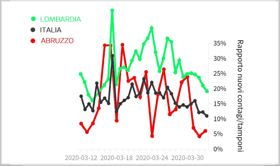 Pescara. Con i nuovi casi registrati ieri la curva epidemica in Abruzzo si ferma appena sotto la fatidica soglia dei 1500. Segnali incoraggianti arrivano dai pazienti guariti che salgono a 113 (+10.8%). Mentre il totale dei malati deceduti, di cui 10 solo nella giornata di ieri, corrisponde all’8,88% 4 punti percentuali sotto la media nazionale che è del 12.7% (Lombardia 17,28% – Piemonte 9,49%), stabile ma comunque in crescita, il numero dei pazienti in terapia intensiva 75(+5.6%).