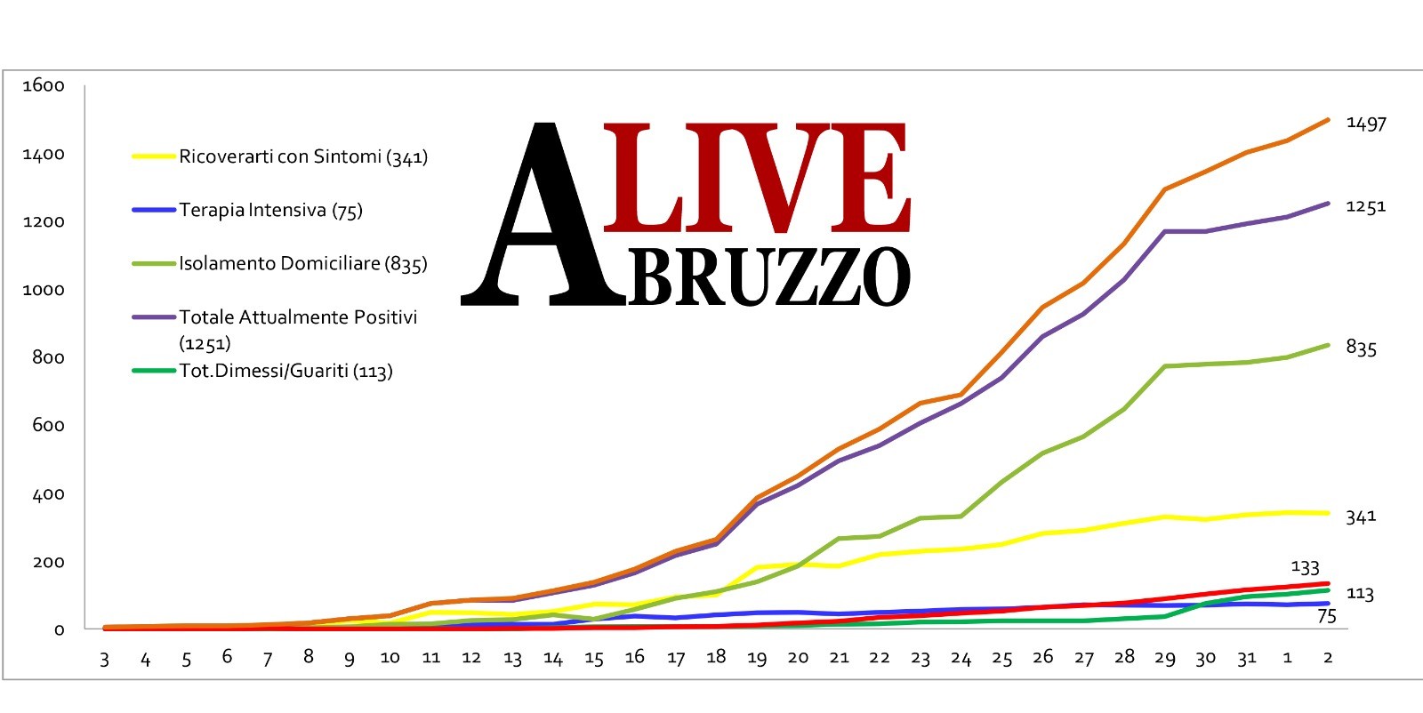 Il bollettino della situazione in Abruzzo – Dall’inizio dell’emergenza, sono stati registrati 1497(+4.2%) casi positivi al Covid 19, diagnosticati dai test eseguiti nei laboratorio regionali. Rispetto al giorno precedente si registra un aumento di 61(+4%) nuovi casi. Il numero degli attualmente positivi è di 1251(+3,3%): 416(+0,7%) i contagiati ospedalizzati e di questi: 341 sono ricoverati nei reparti e 75 in terapia intensiva mentre gli altri 835 sono in isolamento domiciliare con sorveglianza attiva da parte delle Asl. Nel numero dei casi positivi sono compresi anche 133(+8,1%) pazienti deceduti, ma questo numero potrà essere confermato solo dopo che l’Istituto Superiore di Sanità avrà stabilito la causa effettiva del decesso, e 113(+10.8) guariti di cui: 99 che da sintomatici con manifestazioni cliniche associate al Covid 19 sono diventati asintomatici e 14 che hanno risolto i sintomi dell’infezione e sono risultati negativi in due test consecutivi.