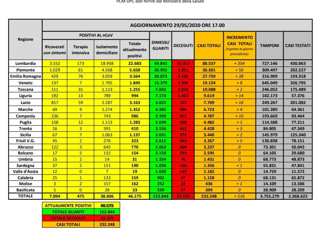 Una nota a fondo bollettino riporta la seguente dicitura: “si segnala che la Regione Abruzzo non ha inviato l’odierno aggiornamento dei dati”.  Molti quotidiani si sono limitati a riportare i dati del giorno precedente in cui l’Abruzzo faceva registrare 3237 casi positivi al Covid 19, diagnosticati dai test eseguiti nel laboratorio di riferimento regionale di Pescara, dall’Istituto Zooprofilattico di Teramo, dall’Università di Chieti e dal laboratorio dell’ospedale dell’Aquila. Nella giornata di ieri (29 maggio) non c’erano stati positivi  su 1.603 tamponi analizzati.