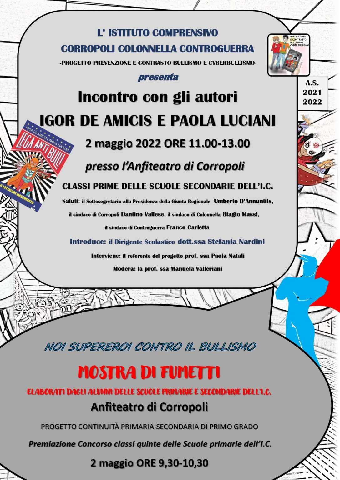 Corropoli. Sensibilizzazione e meeting culturali per dire no al bullismo. “Lunedì 2 maggio, presso l’Anfiteatro comunale di Corropoli (Te)”, scrive il cominciato di Manuela Valleriani, “l’I.C. Corropoli-Colonnella-Controguerra diretto da Stefania Nardini presenta una giornata di riflessione sul fenomeno del bullismo attraverso due eventi dedicati agli studenti. Alle ore 9.30, nell’ambito del Progetto continuità, verrà inaugurata la mostra a fumetti dal titolo “NOI, SUPEREROI CONTRO IL BULLISMO”, a cura della professoressa Paola Natali, con la premiazione del concorso “Storie a fumetti di Rispetto e Gentilezza” riservato a tutte le classi quinte della Scuola primaria dell’Istituto, mentre alle ore 11.00 gli studenti delle classi prime della Scuola secondaria di I grado dei tre plessi incontreranno gli scrittori Igor De Amicis e Paola Luciani, autori della collana “Lega Anti Bulli”, edita da Edizioni Lapis. La manifestazione, moderata dalla professoressa Manuela Valleriani, vedrà la partecipazione, oltre che del Dirigente Scolastico Stefania Nardini e della docente Paola Natali, del sottosegretario alla Presidenza della Giunta Regionale Umberto D’Annuntiis e dei tre sindaci del territorio Dantino Vallese, Biagio Massi e Franco Carletta. Così la docente Natali, docente di Arte e Immagine e referente d’Istituto nell’ambito del Progetto di Prevenzione e contrasto al Bullismo e Cyberbullismo, ha illustrato l’iniziativa e gli obiettivi del progetto: “Troppo spesso le vittime di bullismo sono lasciate sole a dover affrontare dolore e paura; occorre sviluppare empatia, senso di giustizia e rispetto per abbattere i muri di indifferenza e di omertà che nuocciono tanto quanto i palesi atti di bullismo”.