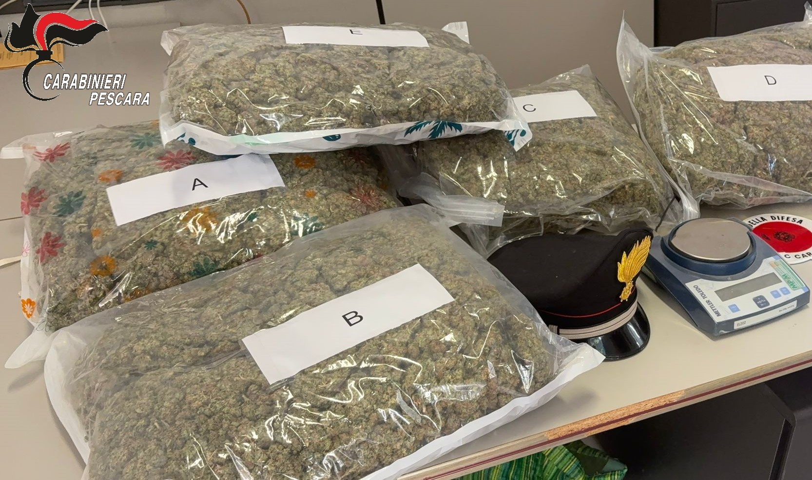 La perquisizione, che veniva estesa anche all’interno dell’abitazione del soggetto che si mostrava sin da subito agitato e preoccupato, consentiva ai militari di rinvenire un ingente quantitativo di sostanza stupefacente e precisamente 9,8 chilogrammi di marijuana, suddivisa in cinque buste sottovuoto, pronte per la conservazione e, con ogni probabilità, per la successiva immissione sul mercato locale.