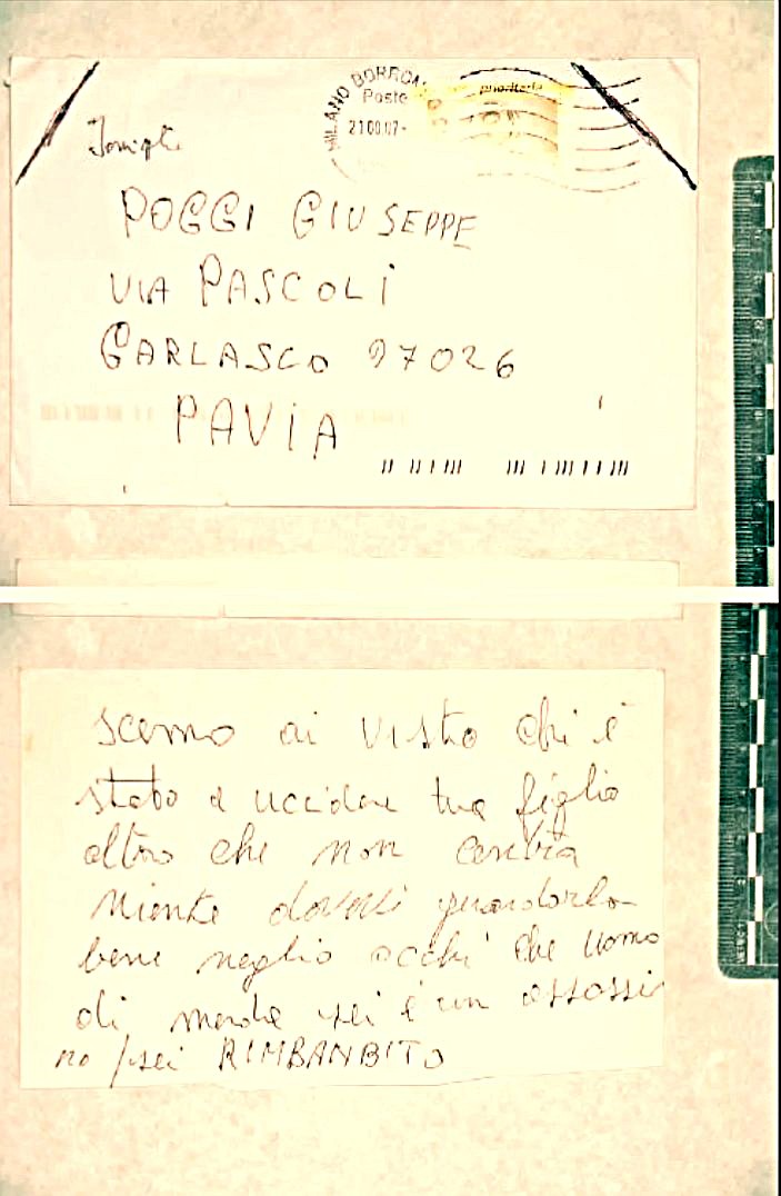 In tema di messaggi anonimi, dalle risultanze della prima inchiesta riemerge poi una lettera spedita al padre della vittima, Giuseppe Poggi, il cui timbro postale sembra riportare la data 21.08.07. Fanpage cita quanto scritto a proposito del reperto in una relazione del Ris, secondo cui “è stato effettuato il test dell’amilasi sul francobollo e sul lembo aperto della busta che ha fornito esito negativo. Nessun prelievo effettuato.”