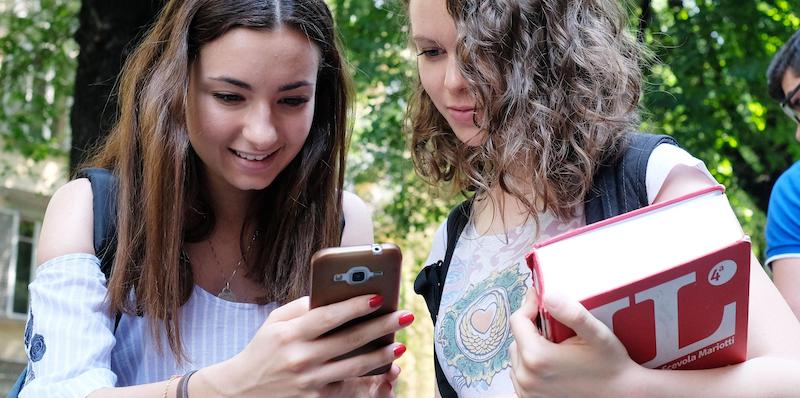 Gli studenti del Liceo Alfieri al termine della seconda prova degli esami di maturit‡ davanti alla scuola, Torino, 22 giugno 2017. ANSA/ALESSANDRO DI MARCO