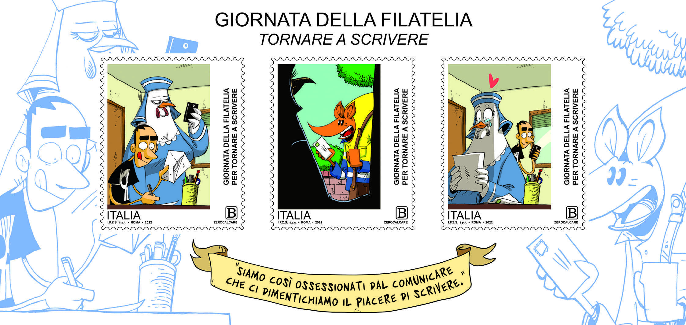 I tre francobolli sono disposti su una fila al centro del foglietto che ripete, a destra e a sinistra, alcuni particolari dei francobolli; in basso, su un cartiglio, è riportata la scritta “SIAMO COSÌ OSSESSIONATI DAL COMUNICARE CHE CI DIMENTICHIAMO IL PIACERE DI SCRIVERE”.