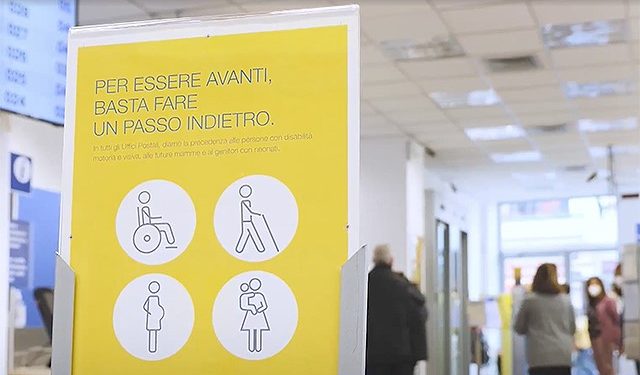 Sul tema della disabilità e dell’attenzione alle fasce più deboli, a partire dal 2015, Poste Italiane ha anche avviato la campagna “Per essere avanti, basta fare un passo indietro”. In tutti gli uffici postali, infatti, è stato posizionato in modo ben visibile un avviso in cui si invita la clientela a dare la precedenza a clienti con disabilità motoria, visiva e uditiva, oltre che alle future mamme e ai genitori con figli neonati.