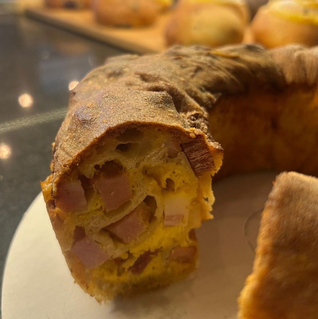 Ed è proprio da qui che il discorso si sposta naturalmente sui lievitati salati, dove questa identità emerge con maggiore chiarezza. Il casatiello viene interpretato a partire da un presupposto preciso: non un impasto ricco costruito ad hoc, ma una base di pane semi-integrale, lavorata con lievito madre e caratterizzata da una leggera acidità. Una scelta che introduce un elemento di contrasto rispetto alla componente grassa del ripieno. All’interno, infatti, la struttura è decisamente generosa: crema di tuorlo, pecorino e parmigiano, arricchita da una selezione di salumi – ventricina, prosciutto cotto e crudo, mortadella – che spingono il prodotto verso una dimensione piena. Il punto interessante è nell’equilibrio: l’acidità dell’impasto alleggerisce la percezione complessiva e evita l’effetto eccessivamente saturo. Anche la lavorazione segue una logica da forno: l’impasto viene trattato come una pagnotta, poi steso, farcito e cotto.