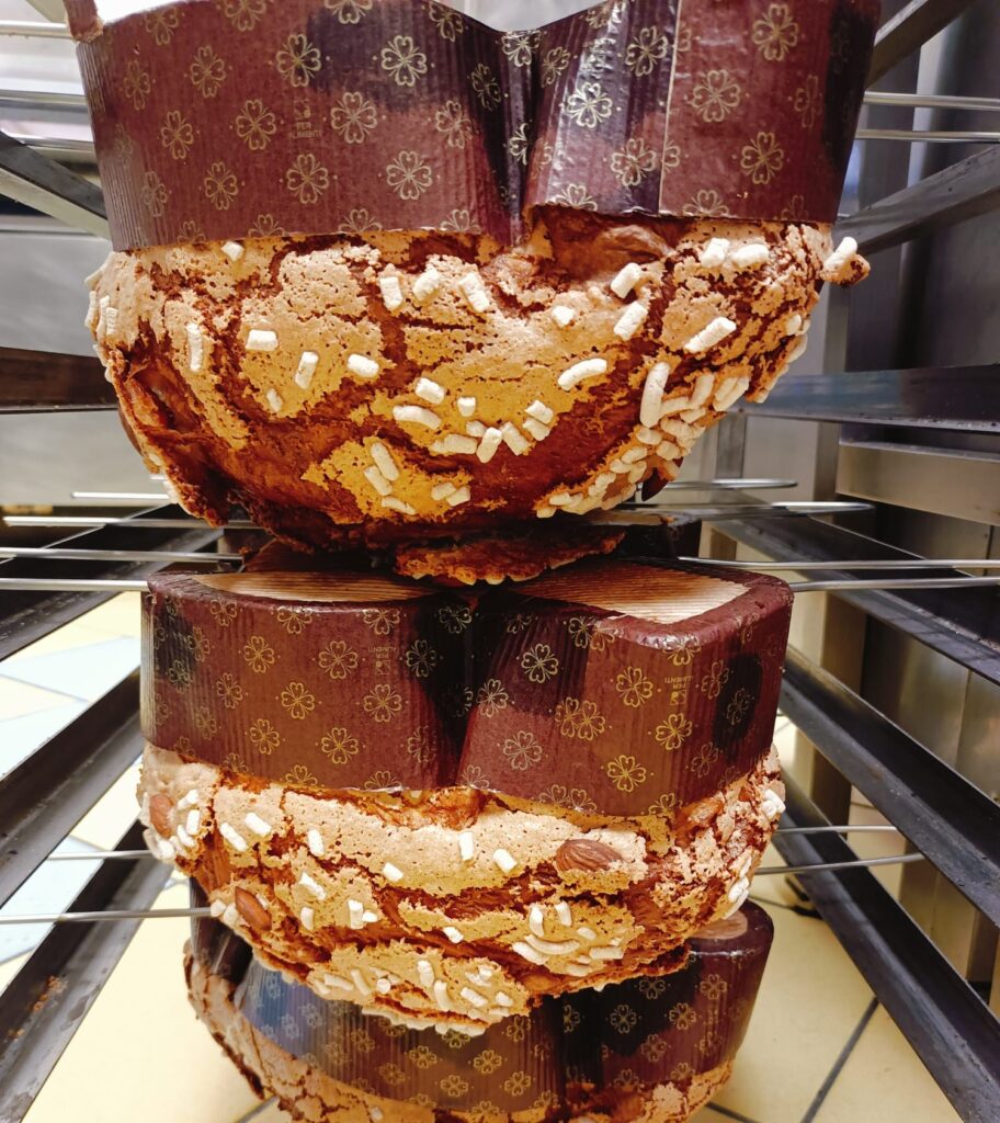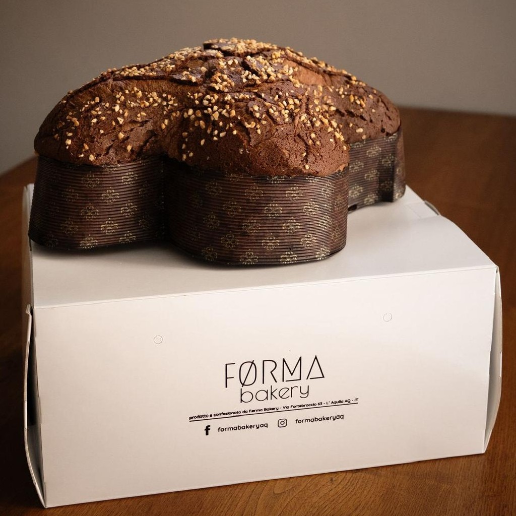 Se la colomba classica misura la tecnica, quella al cioccolato mette in gioco un livello ulteriore di complessità: gestione delle masse, equilibrio tra componente grassa e struttura, tenuta aromatica. Forma Bakery all’Aquila lavora su una linea articolata – tradizionale, cioccolato, lampone, pistacchio – ma è proprio sulla versione al cioccolato che emerge con più chiarezza la loro identità. La base resta quella del grande lievitato, con glassa alle mandorle che introduce una componente croccante, elemento distintivo rispetto al panettone. Ma il punto centrale è nel trattamento del cacao.
