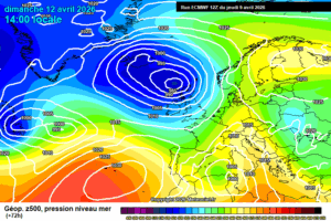 La situazione vista dal modello europeo ECMWF per le ore 14:00 di Domenica 12 Aprile. Inizia la formazione di un minimo depressionario sul mediterraneo che apporterà tempo instabile nei giorni a venire
