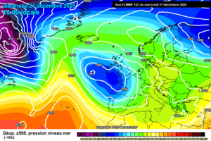 Una perturbazione ci ha lasciati nelle scorse ore con delle precipitazioni moderate lungo l’Abruzzo ed in un contesto mite, con le temperature sopra la norma del periodo in essere. Nei prossimi giorni, avremo delle condizioni spiccatamente variabili per poi assistere ad un nuovo guasto, che al momento appare abbastanza decisa con delle precipitazioni moderate nelle giornate di Lunedì e Martedì. Quindi Giovedì 18 Dicembre, al mattino avremo un cielo tra variabile e spiccatamente nuvoloso. Nel corso delle ore pomeridiane, ampie schiarite ove troveranno spazio solo delle stratificazioni di passaggio. Venti generalmente da sud ovest, deboli con qualche locale rinforzo, da est lungo le coste e temperature in leggero aumento nei valori massimi (+7/+8°c ad 850 hpa). Venerdì, condizioni discrete, con degli addensamenti alternati ad ampie schiarite. Ventilazione debole orientale e temperature in lieve calo. Sabato, della nuvolosità sarà presente soprattutto sulle aree a stau orientale come i monti della Laga, Gran Sasso, Maiella e Frentani per i venti da est, seppur di debole entità. Temperature in diminuzione di qualche grado (+4/+5°c ad 850 hpa). Passerà alquanto variabile anche la giornata di Domenica 21, con il cielo in parte nuvoloso, specie ad est. Venti da est nord est tra deboli e moderati e temperature senza variazioni di rilievo. Intanto, una perturbazione inizierà ad avvicinarsi da sud ovest nella nottata su Lunedì. Ed in effetti, già dal mattino, dei fenomeni inizieranno sul carseolano ed a seguire su marsicano e praticamente ovunque dal primo pomeriggio. Le precipitazioni potranno risultare moderate sui settori interni. Neve oltre i 1800 m circa. Venti quindi sud occidentali e temperature pressochè stazionarie. Infine Martedì 23, ove al momento sembra che potremo assistere ad un nuovo guasto delle condizioni meteo ad opera di una nuova perturbazione, sospinta da venti occidentali legata ad un minimo depressionario al largo della Corsica. Pertanto piogge via via in estensione nel corso della giornata quasi ovunque, solo le aree costiere potranno rimanere sotto a della variabilità e possibile foehn. Nevicate oltre i 1700 m in calo tra il pomeriggio e la serata attorno a 1500 m sui rilievi posti ad ovest come i Simbruini ed il Velino – Sirente. Temperature in diminuzione specie sulle zone interne (+2/+4°c ad 850 hpa tra ovest ed est).