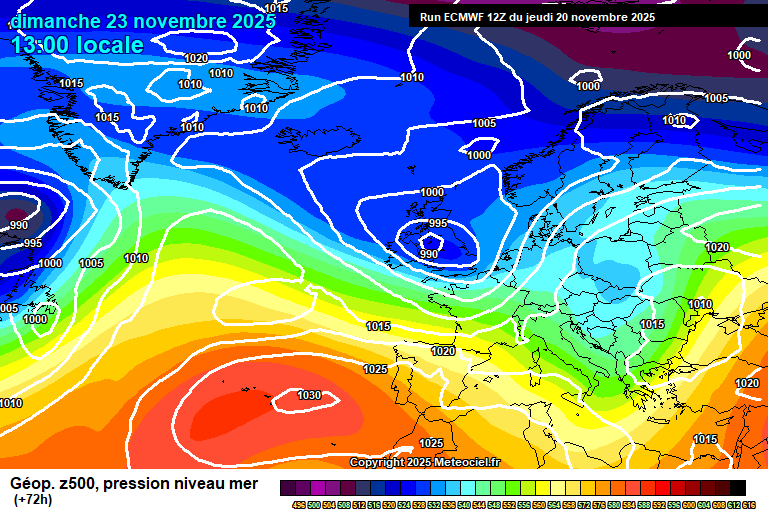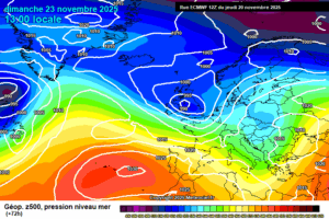 La situazione a 500 hpa vista dal modello europeo ECMWF per le ore 13:00 di Domenica 23 Novembre. Sulla nostra regione, a come sembra, avremo una parentesi di tempo discreto con il cielo tra poco nuvoloso e variabile