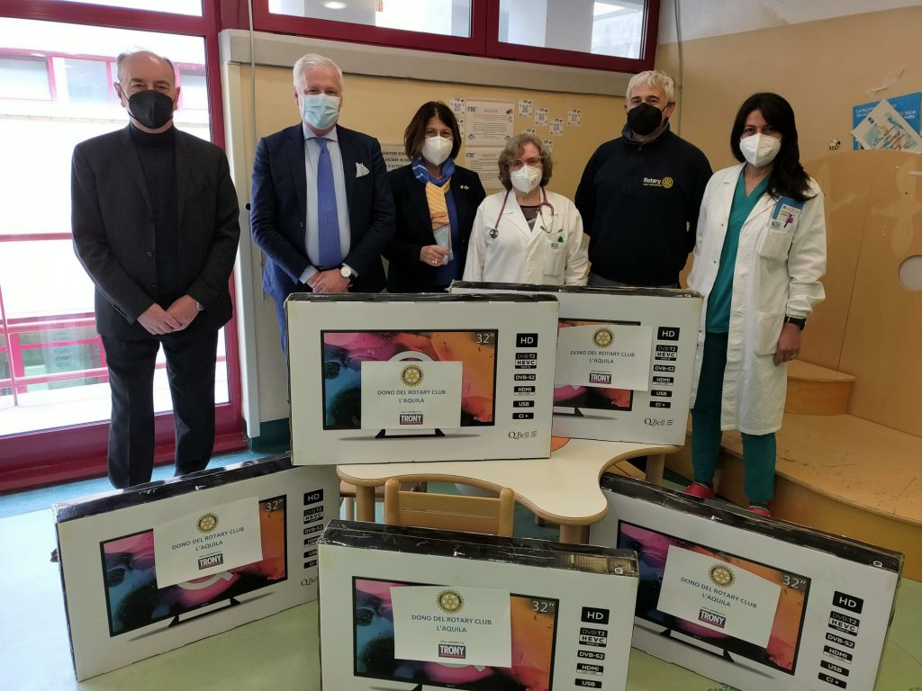 L’Aquila. Il Rotary Club L’Aquila ha consegnato questa mattina al reparto di pediatria, diretto dal dottor Giovanni Farello, cinque televisori di ultima generazione, con relative staffe per installazione a muro destinati