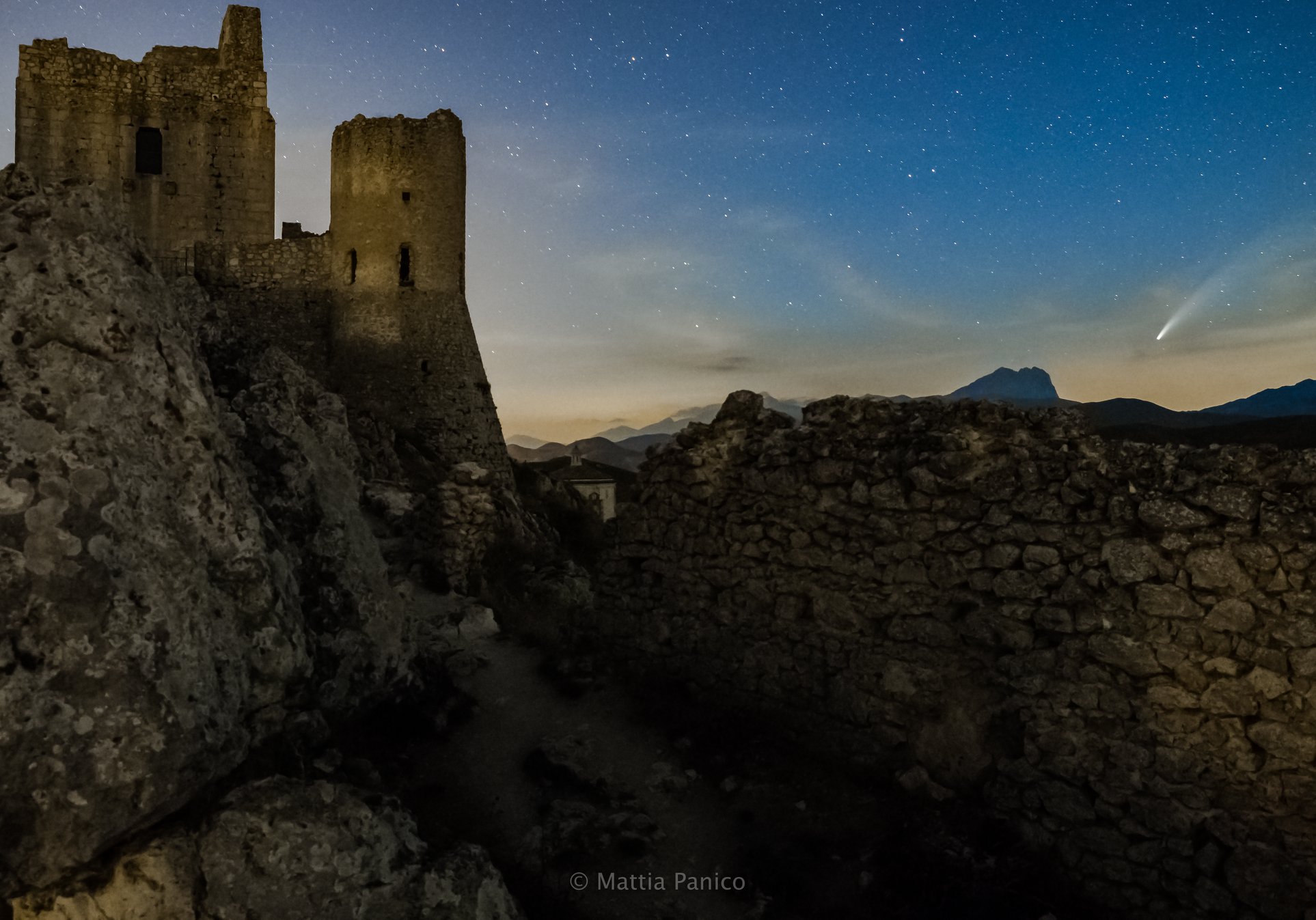 Uno spettacolo magico che è stato immortalato dal giovane abruzzese che, pochi minuti fa, ha pubblicato una foto della cometa che illumina il castello di Rocca Calascio.