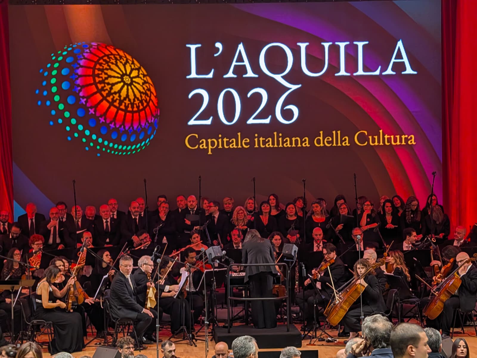 Per l’apertura è stato scelto uno spazio di profondo significato storico: l’Auditorium, che nel 2009 fu centro operativo dell’emergenza post-sisma e sede del G8, riapre oggi alla comunità dopo il restauro. L’evento, organizzato dal Teatro Stabile d’Abruzzo con la direzione artistica del Maestro Leonardo De Amicis, è stato aperto dall’esecuzione del “Canto della Terra”. Sul palco è impegnata una grande orchestra filarmonica che vede collaborare i professori dell’Istituzione Sinfonica Abruzzese, i Solisti Aquilani e gli allievi del Conservatorio “A. Casella”. La conduzione è affidata alla giornalista Francesca Fagnani e a Paride Vitale. Tra i momenti più solenni, i tenori abruzzesi Riccardo Della Sciucca e Lorenzo Martelli hanno intonato l’Inno d’Italia davanti al Capo dello Stato.