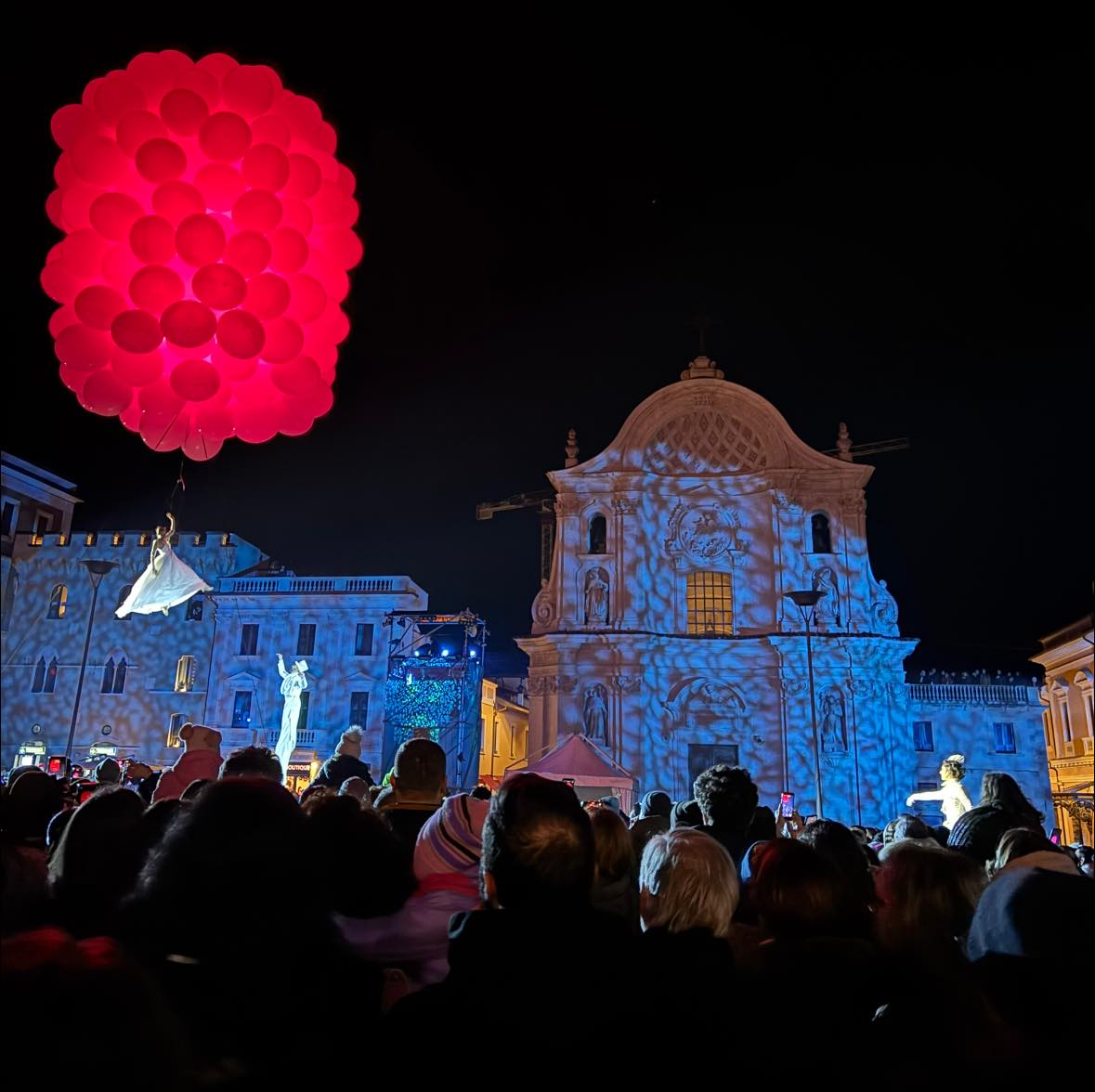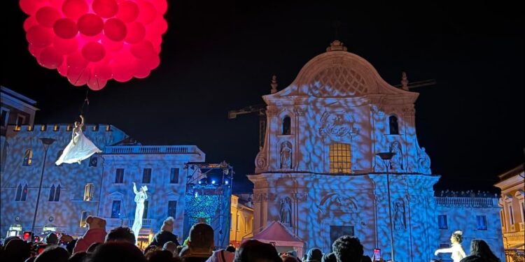 L’evento ha preso il via alla Fontana Luminosa con “Sotto un unico cielo”, un suggestivo spettacolo di droni che ha tenuto i presenti con il naso all’insù, catturando l’emozione dei cittadini tra scatti fotografici e applausi. La magia è proseguita lungo corso Vittorio Emanuele II con la parata di Dundu, il gigante di luce, che ha scortato la folla fino a Piazza Duomo.