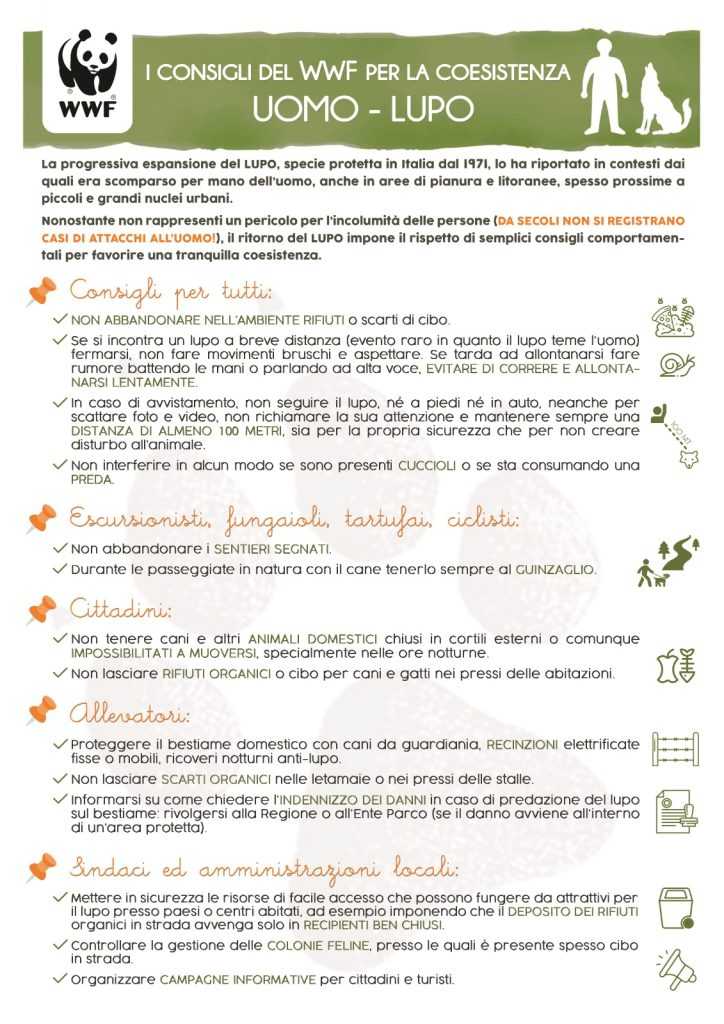 Con l’occasione il WWF Abruzzo ripropone un semplice vademecum realizzato in collaborazione con gli esperti e i tecnici dell’Associazione che contiene una serie di consigli che potrebbero essere anche veicolati da apposite ordinanze comunali, utili per favorire una tranquilla coesistenza tra l’uomo e il lupo.