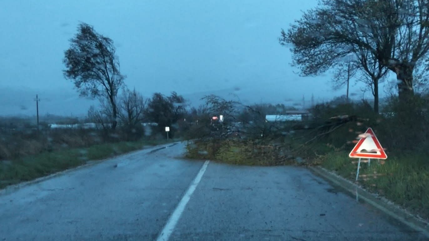 Pescina. Disagi alla viabilità lungo la strada che collega Pescina ad Avezzano, dove un albero abbattuto dal vento sta occupando parte della carreggiata in località Marinacci, poco prima del bivio per Collarmele, nei pressi dei vivai.