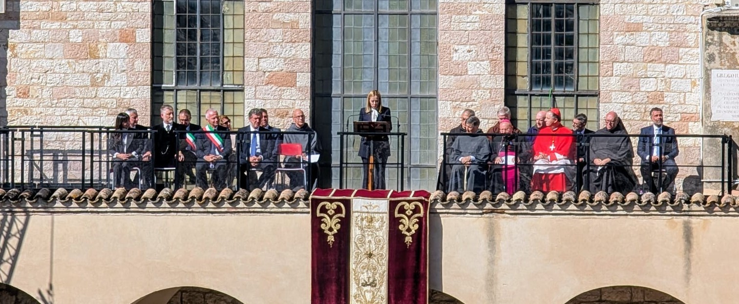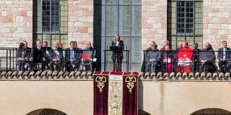 “San Francesco insegnava anche il rispetto, il rispetto nell’ascolto, rispetto nel capirsi e nell’ascoltare il prossimo”. Così il presidente del Consiglio, Giorgia Meloni, ha aperto il suo saluto rispondendo anche alle proteste di quanti chiedevano spiegazioni sulla posizione dell’Italia in merito alla questione palestinese.