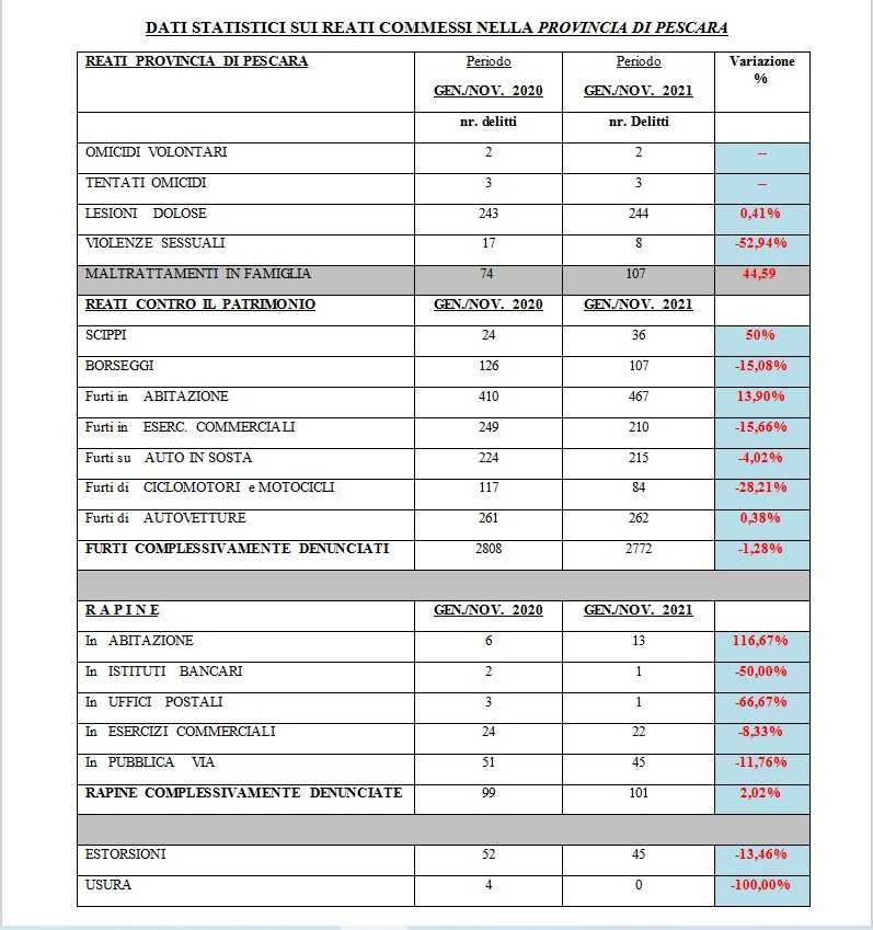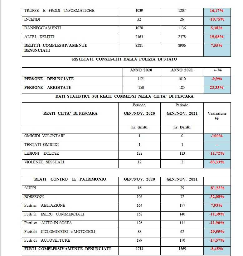 Pescara. Leggero aumento di reati commessi a Pescara e provincia nel 2021, da 8281 dello scorso anno a 8906 di quest’anno. Due gli omicidi nel 2021, tre i tentati omicidi.