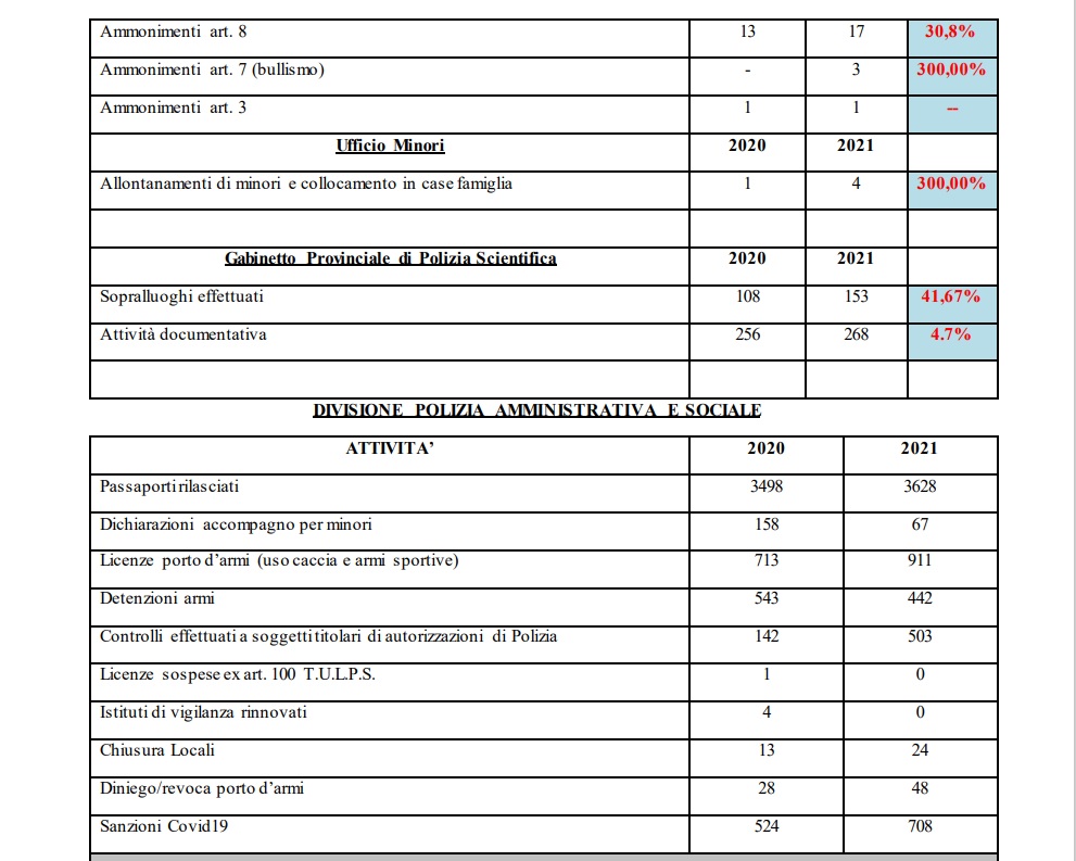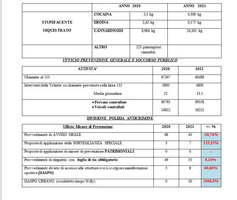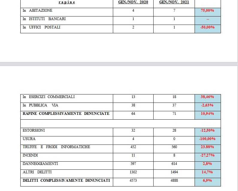 Il dato generale relativo alle rapine appare costante visto che si passa da 99 nel 2020 a 101 nel 2021. Risultano in aumento le rapine in abitazione, ma diminuiscono quelle commesse ai danni di esercizi commerciali e quelle sulla pubblica via. Una la rapina a istituti di credito. Le rapine ai danni di Uffici Postali erano state 3 nel 2020, una quest’anno. I furti sono diminuiti del 1.28% passando da 2.808 a 2.772. In particolare si rileva un aumento del 50% degli scippi che passano da 24 a 36 e una diminuzione dei borseggi, da 126 a 107. I furti in abitazione aumentano del 13% mentre diminuiscono i furti presso gli esercizi commerciali e sulle auto in sosta. “Devo ringraziare – ha detto Liguori – gli uomini e le donne della Polizia di Stato per il lavoro fatto in questo anno in cui voglio ricordare che siamo ancora in emergenza sanitaria così come nel 2020, quando ci fu anche un duro ‘lockdown’. Per questo aggiungo che i dati resi noti e che denotano un leggero aumento dei reati commessi, non possono non essere contestualizzati nel periodo che stiamo vivendo”.