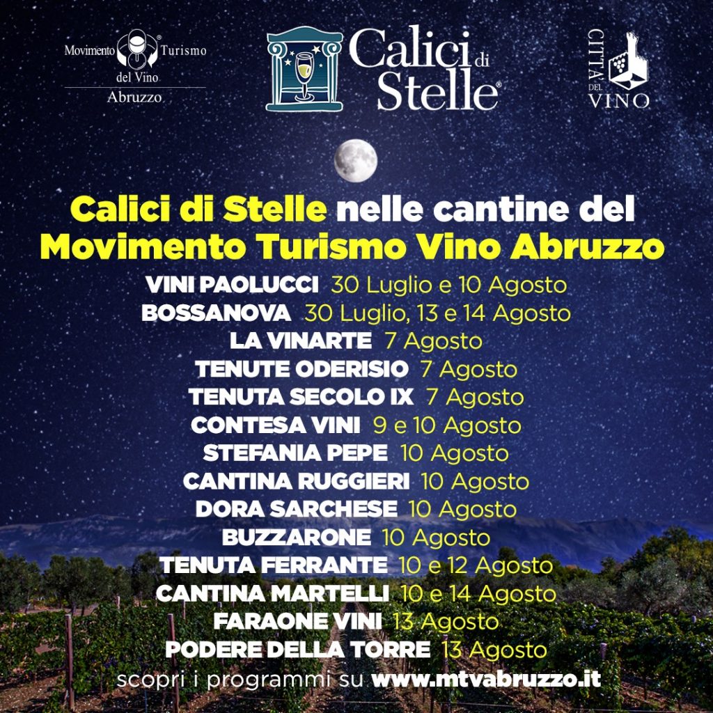Martedì 10 Agosto, notte di San Lorenzo, tante cantine pronte ad accogliere con le già citate Paolucci e Contesa, ma anche Dora Sarchese ad Ortona, Buzzarone a Torrevecchia Teatina, Stefania Pepe a Torano Nuovo, Cantine Ruggieri ad Atri,Tenuta Ferrante a Lanciano e Cantina Martelli a Ripa Teatina che replicherà anche il 14 Agosto