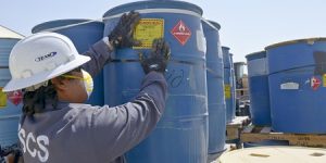 Chip Harris assists local government contractor Marino Menor label waste fuel drums at the 379th Air Expeditionary Wing in Southwest Asia, Oct. 15, 2013. All waste fuel drums is labeled and weighted before transferring to the recycling plant. Harris is a 379th Expeditionary Civil Engineer Squadron Hazardous Waste Transit Area supervisor and hails from Atlanta. (U.S. Air Force photo/Tech. Sgt. Joselito Aribuabo)