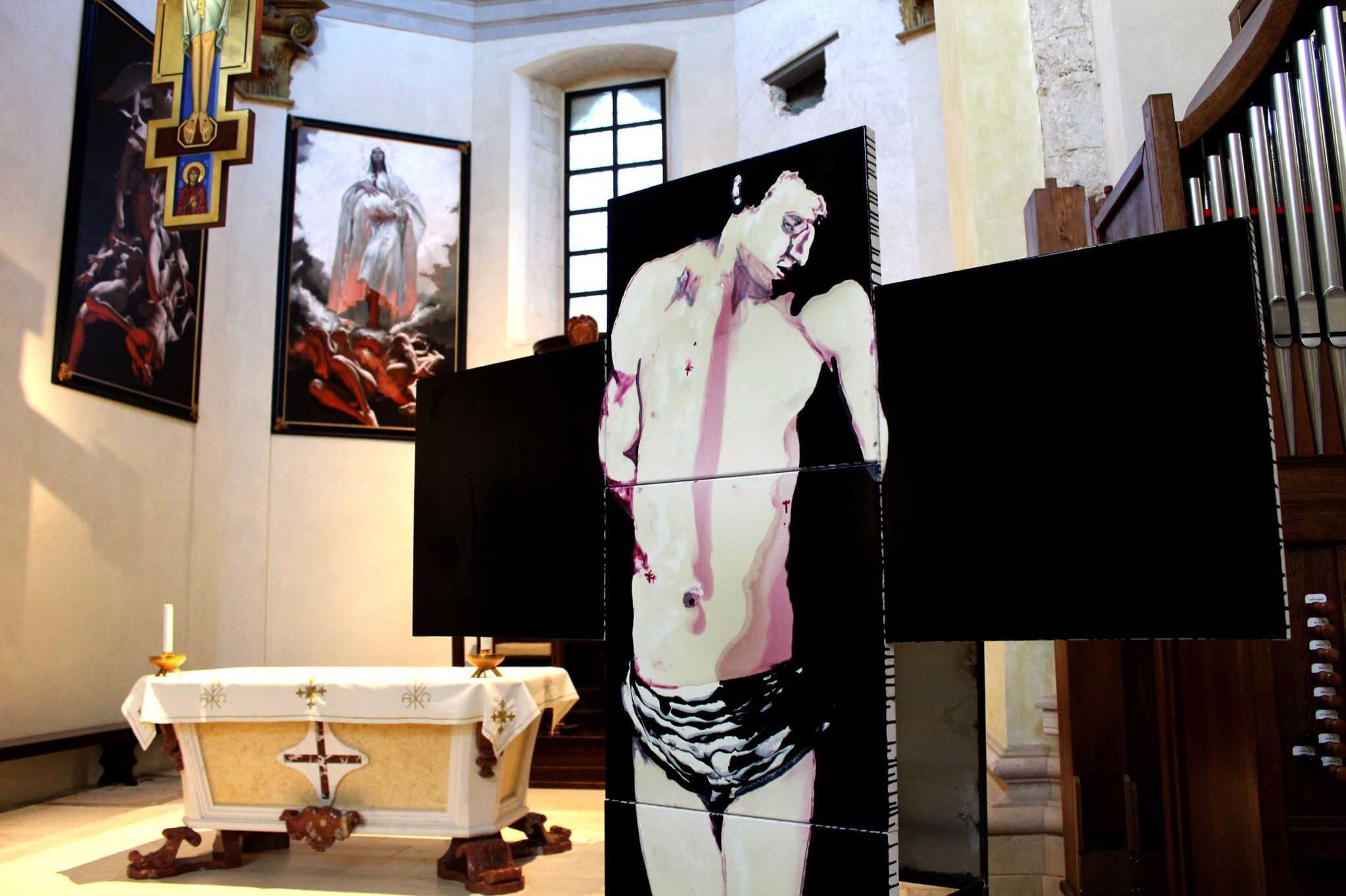 L’installazione è composta da 5 tele disposte a forma di croce e su questa superficie è raffigurato lo statuario corpo del santo agonizzante, con le ferite prodotte dalle frecce.