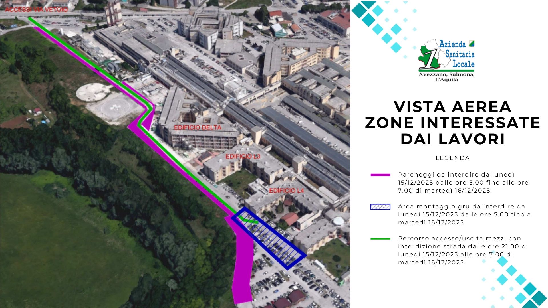 L’Aquila. La Direzione della ASL 1 Avezzano-Sulmona-L’Aquila informa che, nell’ambito degli interventi finanziati dal PNRR in corso presso l’ospedale San Salvatore dell’Aquila, nelle giornate di lunedì 15 e martedì 16 dicembre saranno effettuate le operazioni di trasporto e montaggio della gru destinata al cantiere dell’edificio L4.