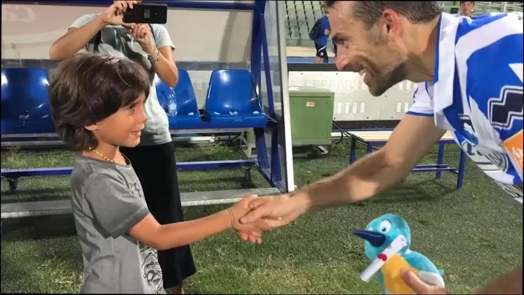 Pescara. Nella foto, il piccolo Riccardo, affetto da fibrosi cistica, una malattia genetica, accolto in campo dai giocatori del Pescara, ...