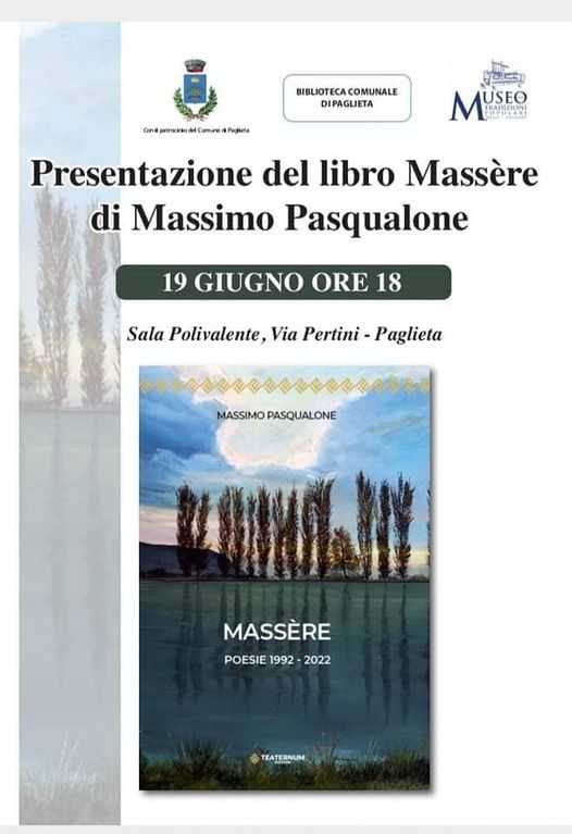 Paglieta. Domani, domenica 19 giugno, alle ore 18,00, nella sala polivalente, di Via Pertini, a Paglieta, sarà presentato il volume “Masserè” ( raccolta di poesie dal 1992 al 2022) di Massimo Pasqualone, poeta e critico d’arte, letterario ed operatore culturale abruzzese.