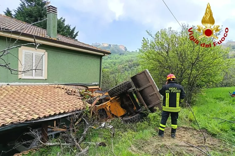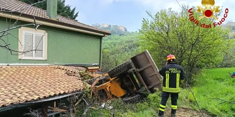 Secondo una prima ricostruzione il mezzo, una ruspa per il movimento terra, è rotolato lungo un pendio a bordo carreggiata, finendo per schiantarsi contro la facciata di un’abitazione e travolgendo una adiacente tettoia in legno.