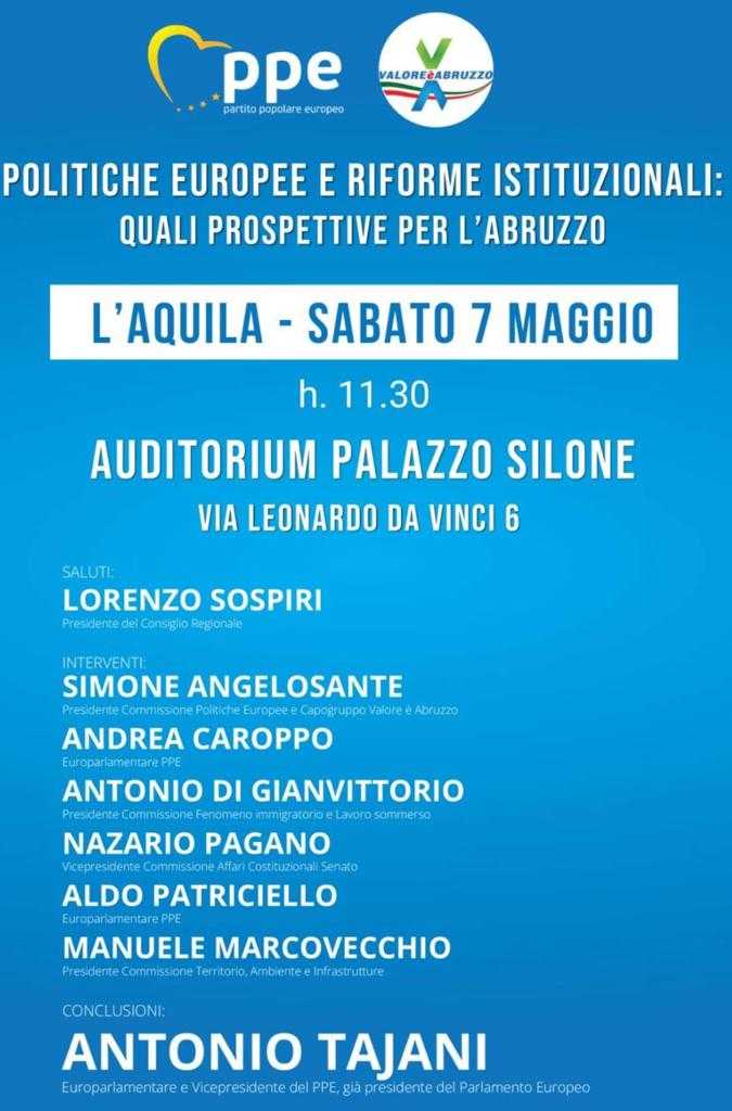 Parteciperanno Lorenzo Sospiri, Presidente del Consiglio regionale Abruzzo, Andrea Carroppo, europarlamentare PPE, Nazario Pagano, vice presidente Commissione Affari Costituzionali Senato, Aldo Patriciello, europarlamentare PPE, e Antonio Tajani, europarlamentare e vice presidente del PPE, già Presidente del Parlamento europeo.