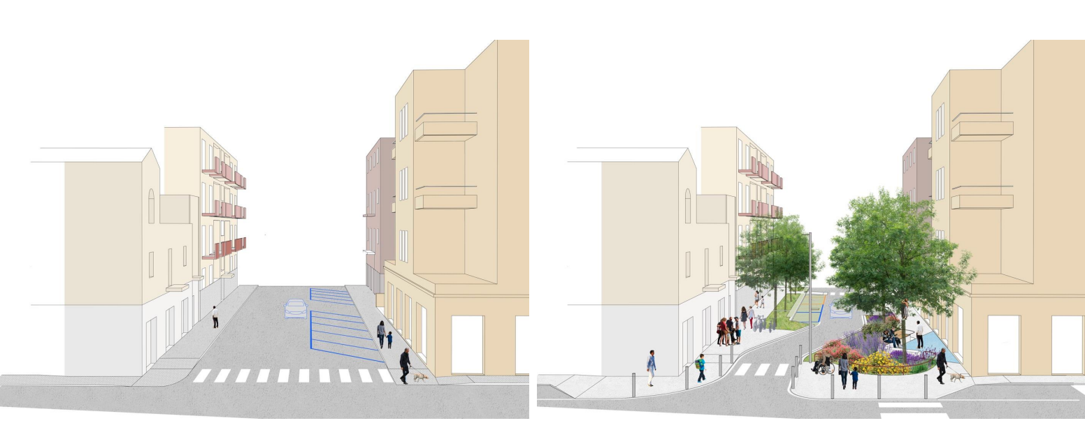 Nella parte compresa tra via Ravenna e via Trieste, il progetto punta a incrementare significativamente la presenza di verde rispetto alla situazione attuale, con nuova pavimentazione e un approccio complessivo orientato alla sostenibilità. Saranno impiegati materiali permeabili, creando una vera e propria “superficie spugna” in grado di gestire in modo efficace gli eventi climatici estremi e le precipitazioni intense. Le pendenze saranno studiate per favorire il convogliamento dell’acqua verso dispositivi vegetali capaci di assorbire grandi quantità di acque meteoriche. La vegetazione sarà selezionata con criteri funzionali e didattici: alberi ad alto fusto in grado di creare ombra e mitigare le alte temperature grazie al principio dell’evapotraspirazione; arbusti e piante basse per caratterizzare le aree centrali delle aiuole; un sistema di targhette informative, pensate come supporto educativo per studenti e cittadini.