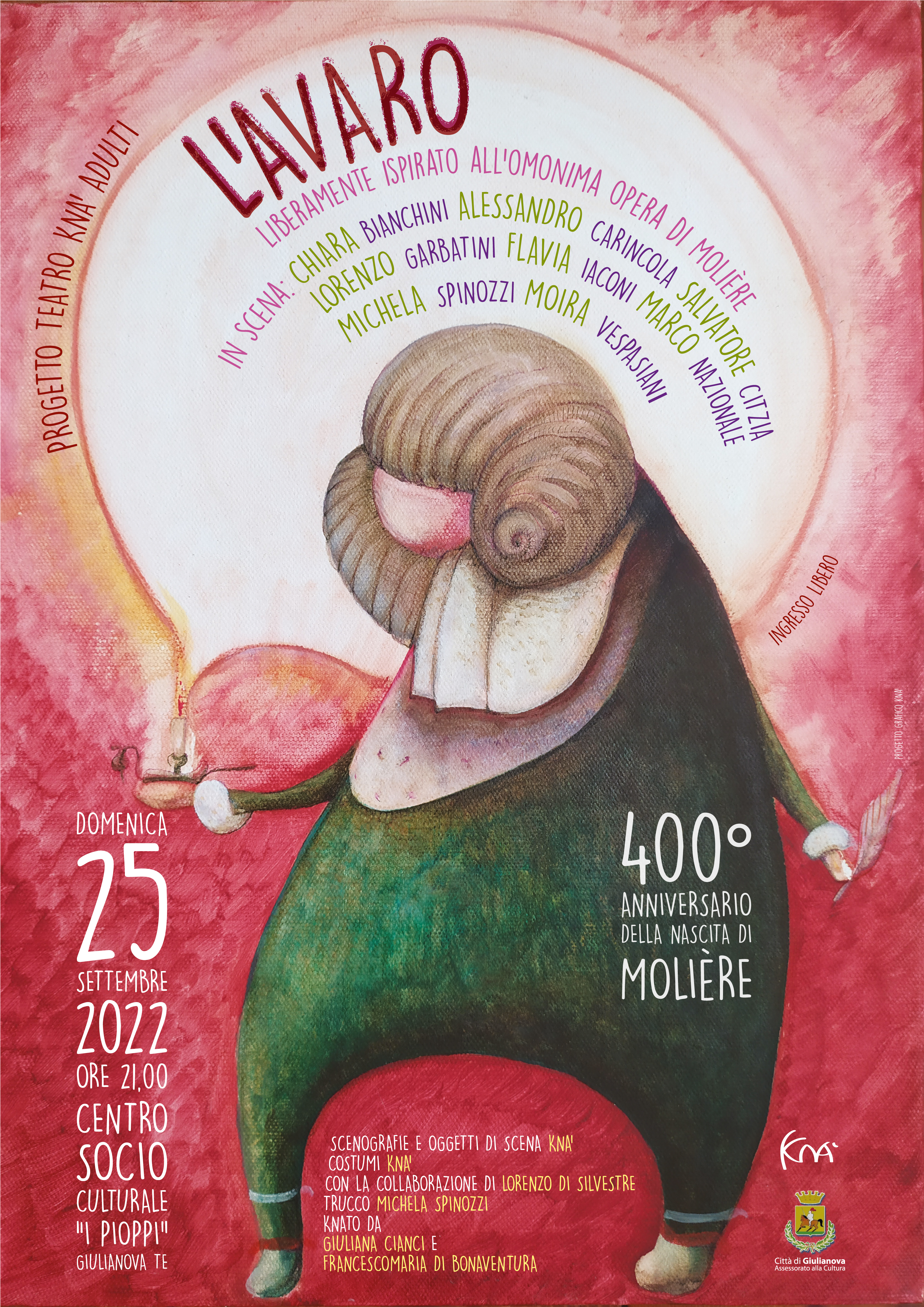 Giulianova. Domenica 25 settembre, gli allievi del corso di teatro tenuto dall’Associazione Culturale Knà di Giulianova, in provincia di Teramo, andranno in scena con lo spettacolo liberamente ispirato all’opera di Molière, di cui ricorre il 400esimo anniversario della nascita.