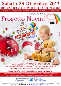 Pescara. L’associazione Progetto Noemi Onlus consegnerà il 23 dicembre dalle ore 10 insieme a Babbo Natale doni alla pediatria di Pescara e Utie. Nell’occasione ci saranno anche i clown dell Associazione Will Clown. Un gesto di vicinanza concreta ai bambini, famiglie che passeranno le feste di Natale ricoverati in Ospedale. Ai pazienti del centro Trapianti, un augurio di forza e coraggio rivolto a chi in questi giorni lotta la battaglia più importante della vita.Sara’ consegnato il “Babbo Natale ” di cioccolato unitamente a sorrisi e solidarietà. ll progetto Noemi Onlus, grazie ai sostenitori,ogni anno visita i pazienti per testimoniare la concreta vicinanza. Sono incontri che riempiono l anima e sottolineano l importanza del Volontariato! www.progettonoemi.com