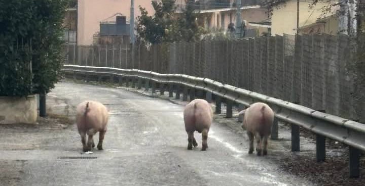 Avezzano. “Buongiorno, ad Avezzano tutto è possibile, vero? Tra via Campania e via Abruzzi tutto può accadere”. Così un cittadino, con un misto di ironia e rassegnazione, ha denunciato sui social una scena che ha lasciato molti abitanti tra il divertito e il perplesso: tre maiali che passeggiavano liberamente lungo la strada, come se nulla fosse.