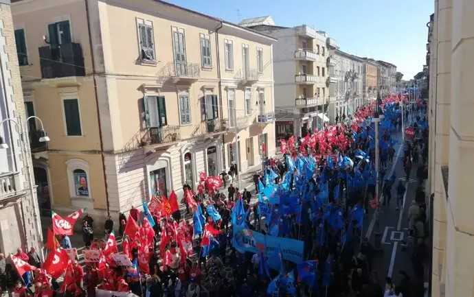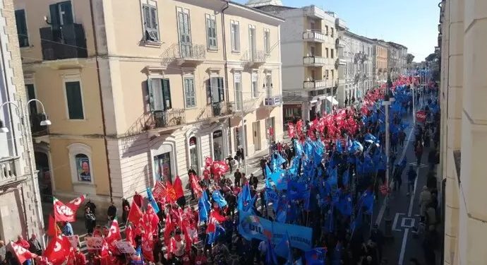 Lanciano. Sono state stimate in circa 3.000 persone i partecipanti allo sciopero generale regionale d’Abruzzo in svolgimento a Lanciano. I lavoratori e le lavoratrici sono giunti con 30 autobus e numerose corse di treni speciali dall’intera regione. La manifestazione si è aperta alle 10.35 partendo da viale delle Rose percorrendo poi Corso Trento e Trieste per approdare a Piazza Plebiscito con un lungo percorso che è stato totalmente riempito dai manifestanti.