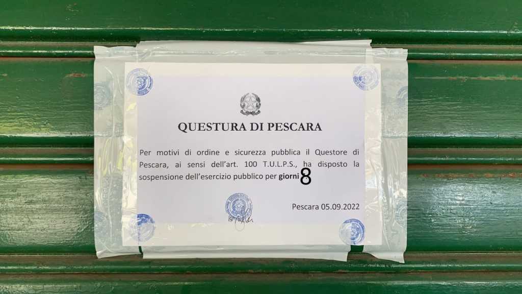 Pescara. Due esercizi pubblici sono state temporaneamente sospesi dal Questore Luigi Liguori, quale Autorità Provinciale di Pubblica Sicurezza.