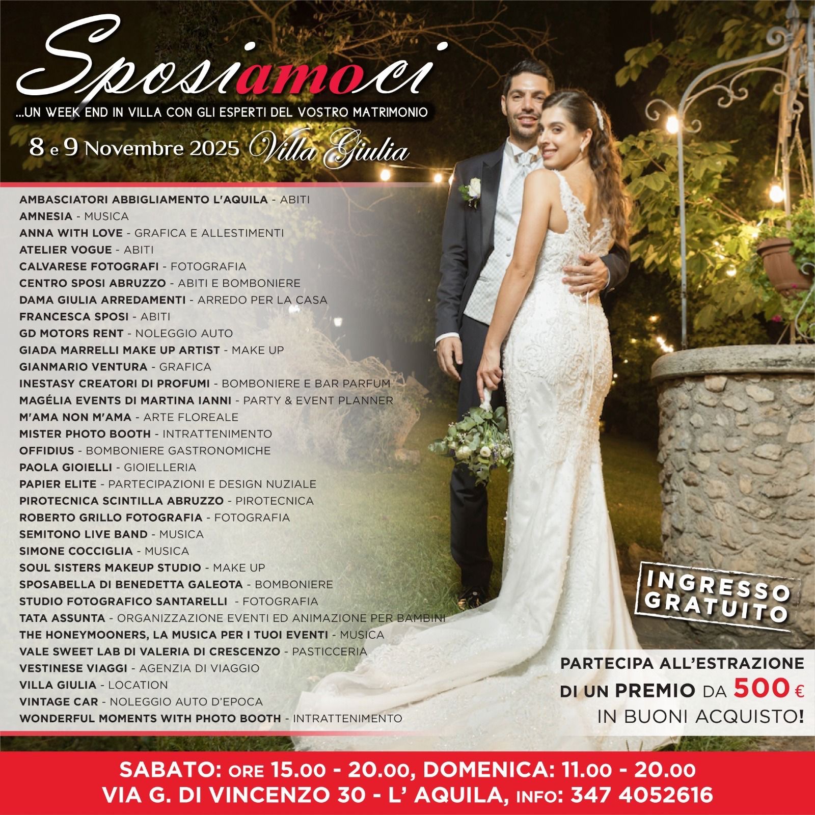 Organizzare un matrimonio è un’emozione unica, ma anche una sfida: tra fiori, abiti, location, musica, bomboniere, fotografi e centinaia di dettagli da curare, ogni coppia cerca la guida giusta per rendere perfetto il proprio “sì”. Per aiutare i futuri sposi a vivere con gioia e ispirazione questo percorso, torna uno degli appuntamenti più attesi del settore wedding: “Sposiamoci”, la due giorni immersiva firmata Villa Giulia, storica location aquilana dedicata ai grandi eventi che ospiterà 32 professionisti del settore.