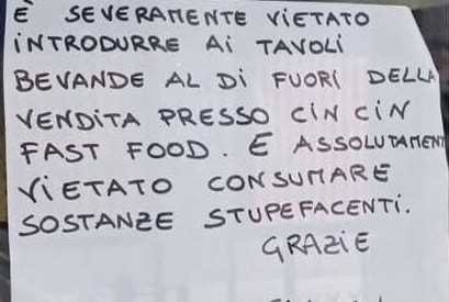 Il messaggio, scritto a mano su un foglio di carta, recita: “È severamente vietato introdurre ai tavoli bevande al di fuori della vendita presso Cin Cin Fast Food. È assolutamente vietato consumare sostanze stupefacenti. Grazie”.