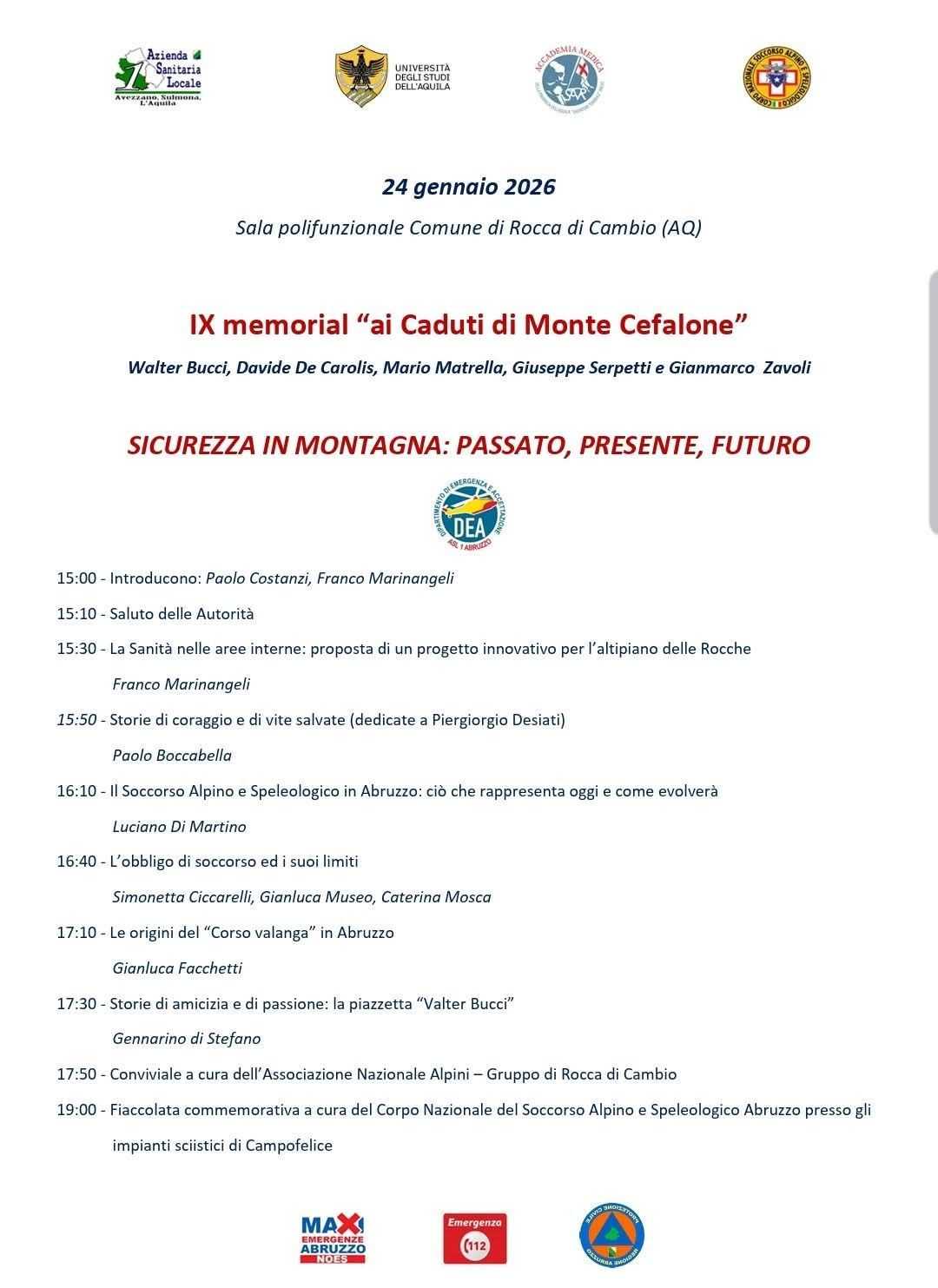 Rocca di Cambio. Il 24 gennaio 2026 rappresenta una data di forte valore simbolico per l’Abruzzo, che si stringe nel ricordo di una delle pagine più dolorose legate al sistema dei soccorsi in montagna. A nove anni dalla tragedia dell’elisoccorso del 118 avvenuta sul Monte Cefalone, la memoria collettiva torna a Rocca di Cambio per il IX Memorial “ai Caduti di Monte Cefalone”, in programma presso la Sala Polifunzionale del Comune.