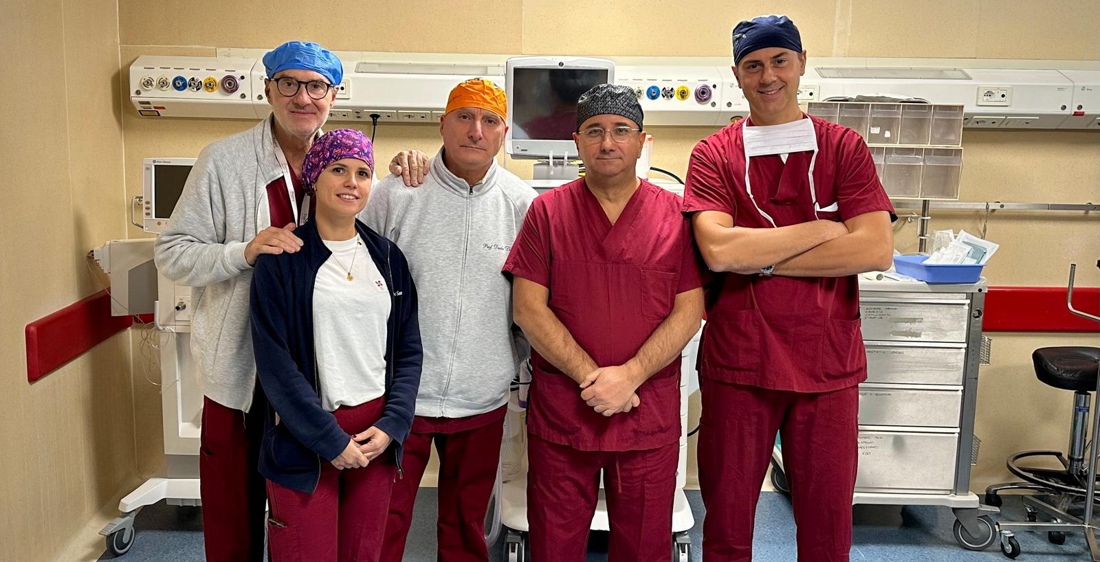 Dopo un percorso di chemioterapia e immunoterapia neoadiuvante, effettuato per ridurre la massa e rendere possibile la chirurgia, il paziente è stato sottoposto a una complessa procedura operatoria. Il trattamento chirurgico ha previsto la rimozione del tumore mediante lobectomia polmonare inferiore sinistra, la demolizione della porzione di parete toracica infiltrata, con asportazione delle strutture coinvolte (coste, muscoli e cute), e la successiva ricostruzione parietale attraverso il posizionamento di una protesi biologica ADM (Acellular Dermal Matrix) nella sede priva delle costole. A completamento della riparazione è stato effettuato il trasferimento di un lembo muscolo-cutaneo destro, utilizzando il muscolo gran dorsale controlaterale, così da ricostituire l’integrità anatomica e funzionale della parete toracica.
