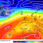 La situazione a 500 hpa prevista per le ore 14:00 di Domenica 20. In Abruzzo, cielo poco nuvoloso al mattino, seguiranno dei rovesci nel corso del pomeriggio. Temperature sempre molto miti.